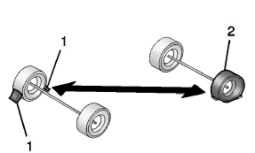 Si l'un des pneus du véhicule est à plat (2), se reporter à l'exemple suivant pour vous aider à poser les cales de roues (1).