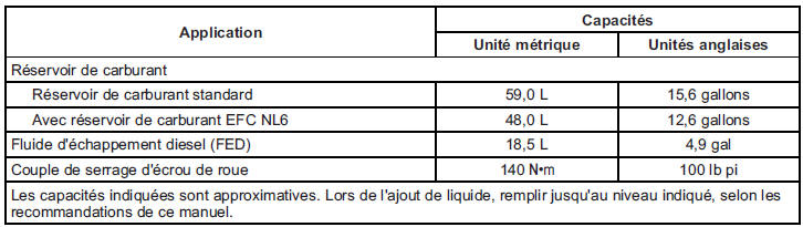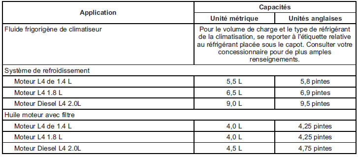Chevrolet Cruze: Capacités et spécificationsLes capacités approximatives suivantes sont données selon des conversions anglaises et métriques. Pour obtenir de plus amples renseignements, se reporter à Liquides et lubrifiants recommandés à la page 11-17.