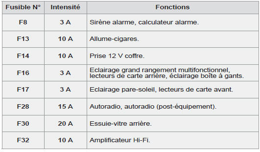 Le remplacement d’un fusible non mentionné dans les tableaux ci-après pourrait entraîner un dysfonctionnement grave sur votre véhicule. Consultez le réseau CITROËN ou un atelier qualifié.