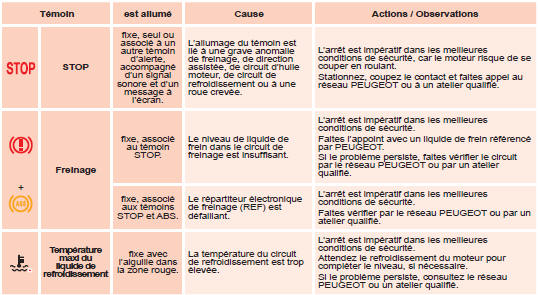Peugeot 308: Témoins d’alerteMoteur tournant ou véhicule roulant, l’allumage de l’un des témoins suivants indique l’apparition d’une anomalie nécessitant l’intervention du conducteur.